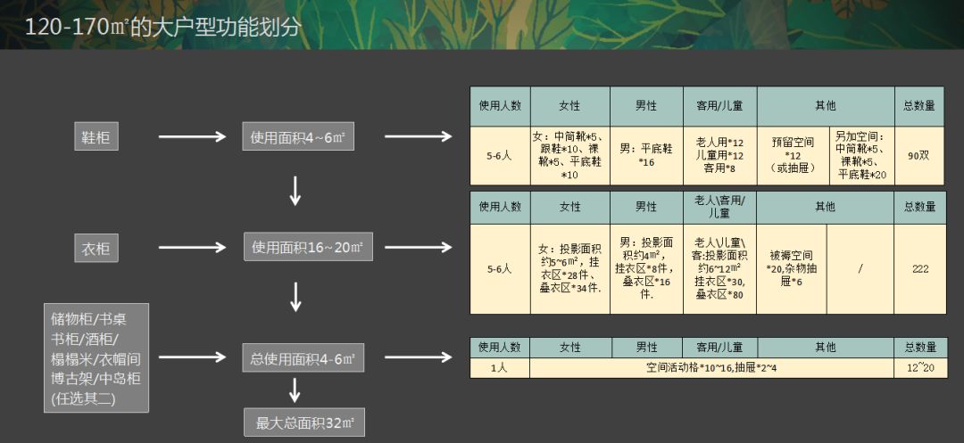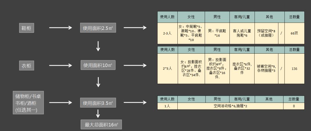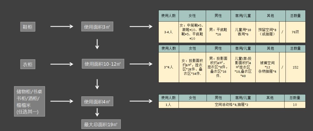 这五个部分按照不同的比率来规划各自的收纳占比,不同的户型及面积有所不同。